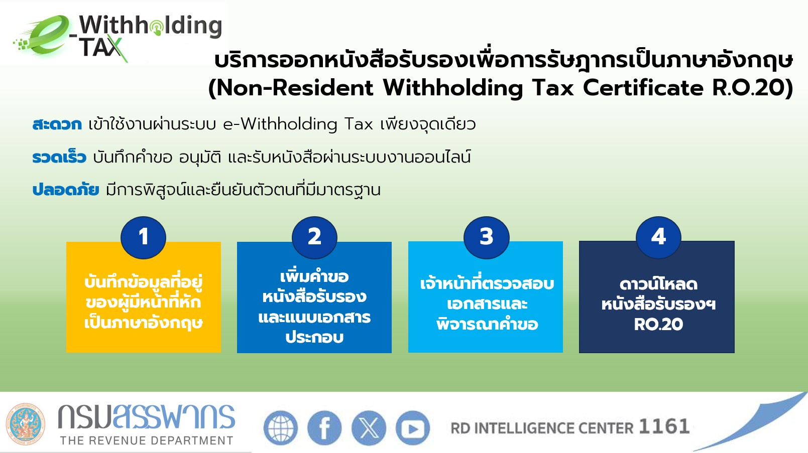 กรมสรรพากรเปิดใช้งานแบบสำรวจความพึงพอใจต่อการให้บริการเว็บไซต์ระบบ e-Withholding Tax เพื่อสำรวจความพึงพอใจต่อการใช้งานบริการเว็บไซต์ระบบ e-Withholding Tax และนำผลจากการประเมิน ไปพัฒนา ปรับปรุง และแก้ไข การให้บริการ เพื่อให้มีคุณภาพอย่างต่อเนื่อง
